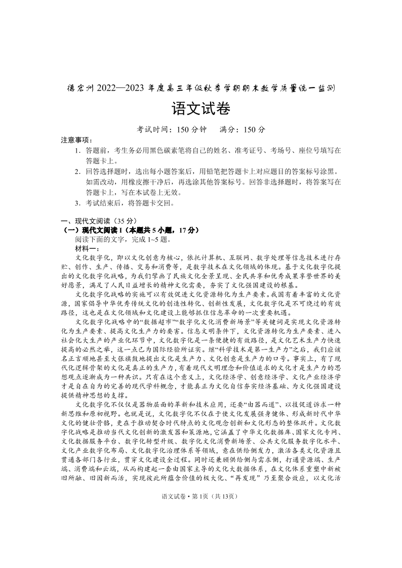 高三语文--云南省德宏州2023届高三上学期期末考试