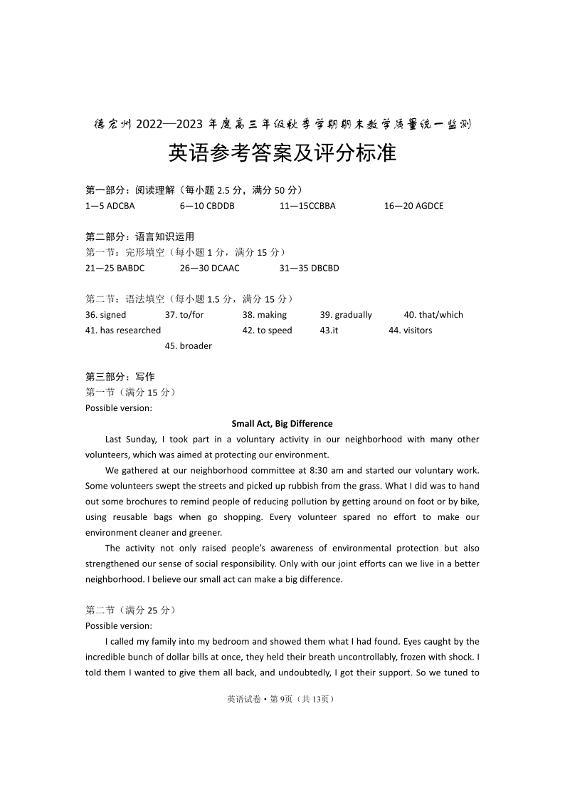 高三英语答案--云南省德宏州2023届高三上学期期末考试