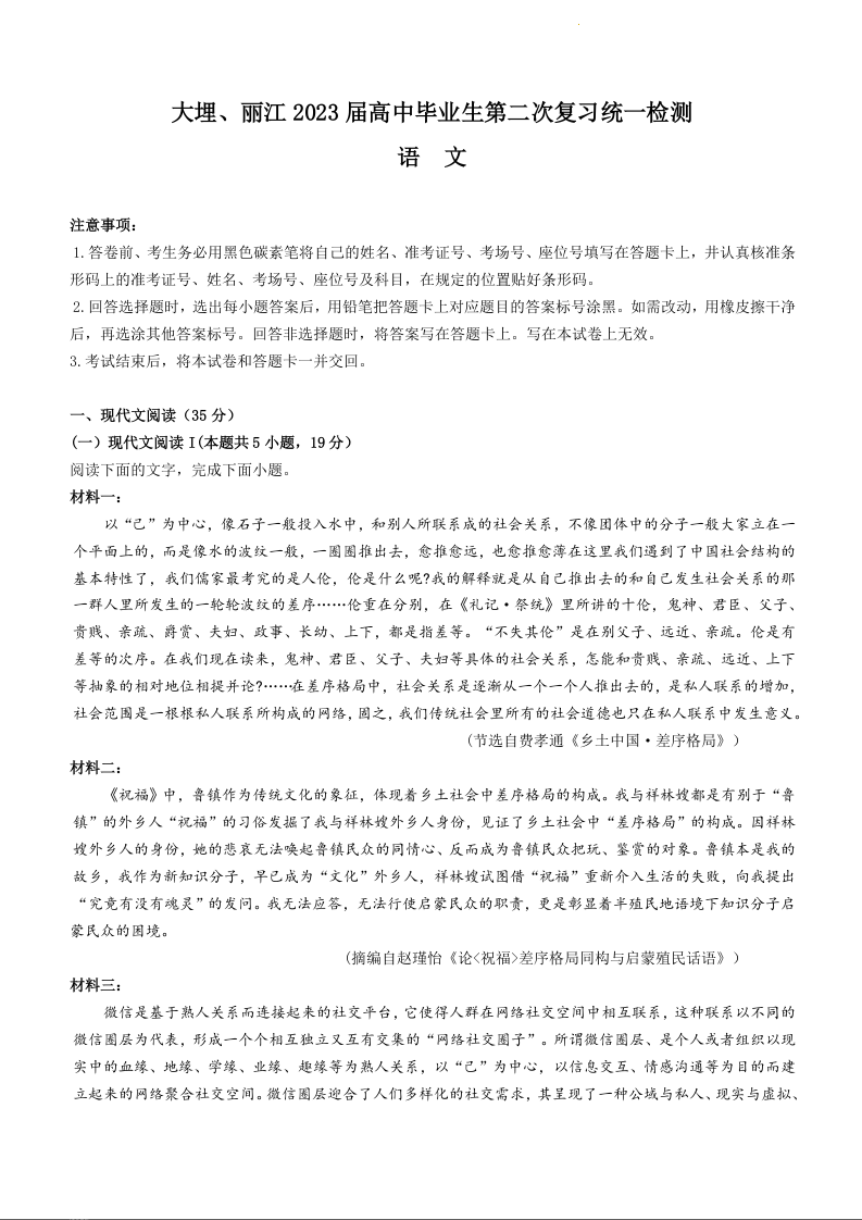高三语文+答案--云南省大理、丽江、怒江2023届高中毕业生第二次复习统一检测