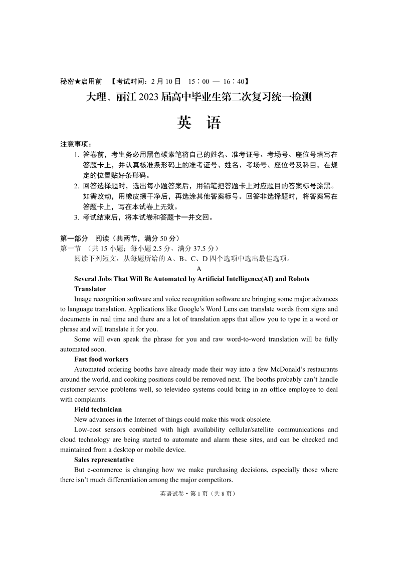 高三英语+答案--云南省大理、丽江、怒江2023届高中毕业生第二次复习统一检测