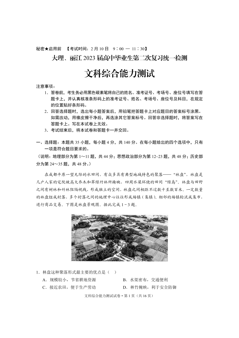 高三文综+答案--云南省大理、丽江、怒江2023届高中毕业生第二次复习统一检测