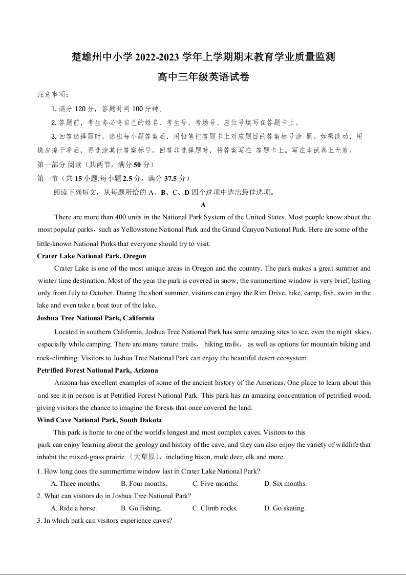 高三英语--云南省楚雄彝族自治州2022-2023学年高三上学期期末教育学业质量监测