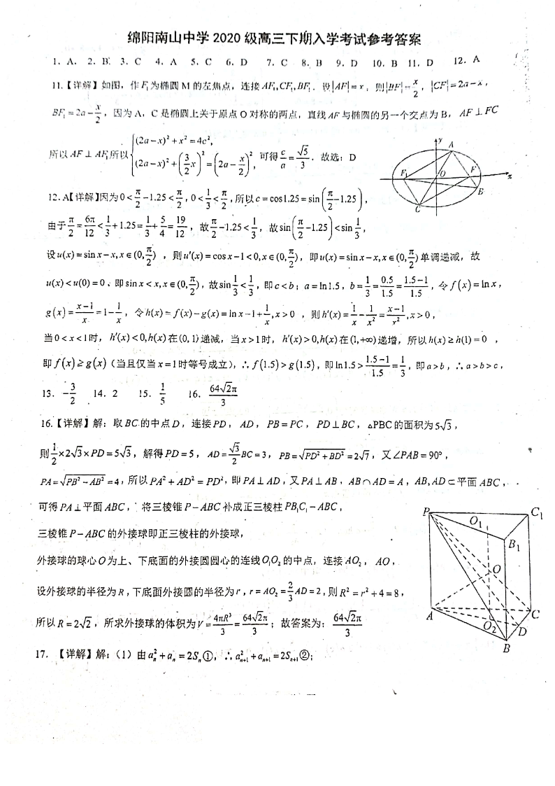 高三理数答案--四川省绵阳南山中学2022-2023学年高三下学期开学考试