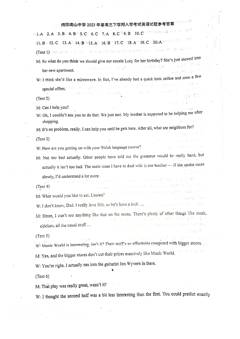 高三英语答案--四川省绵阳南山中学2022-2023学年高三下学期开学考试