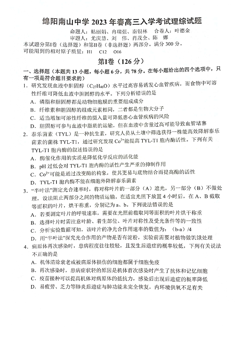 高三理综--四川省绵阳南山中学2022-2023学年高三下学期开学考试