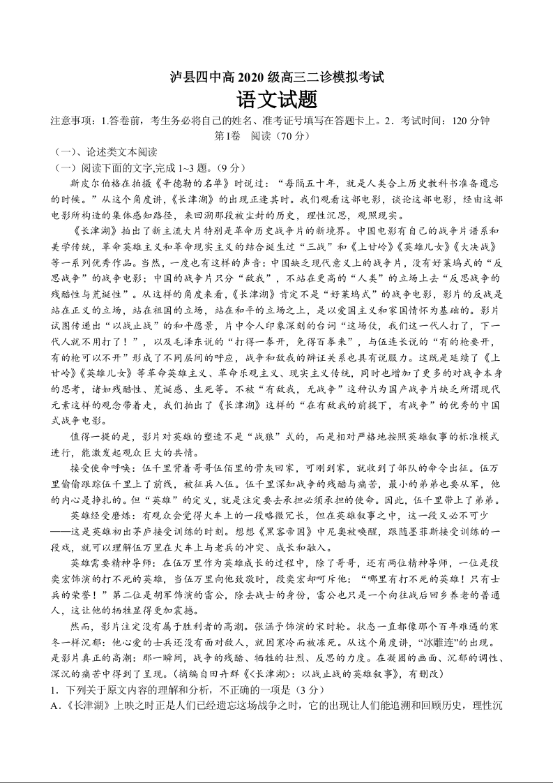 高三语文+答案--四川省泸州市2022-2023学年泸县第四中学高三二诊模拟考试