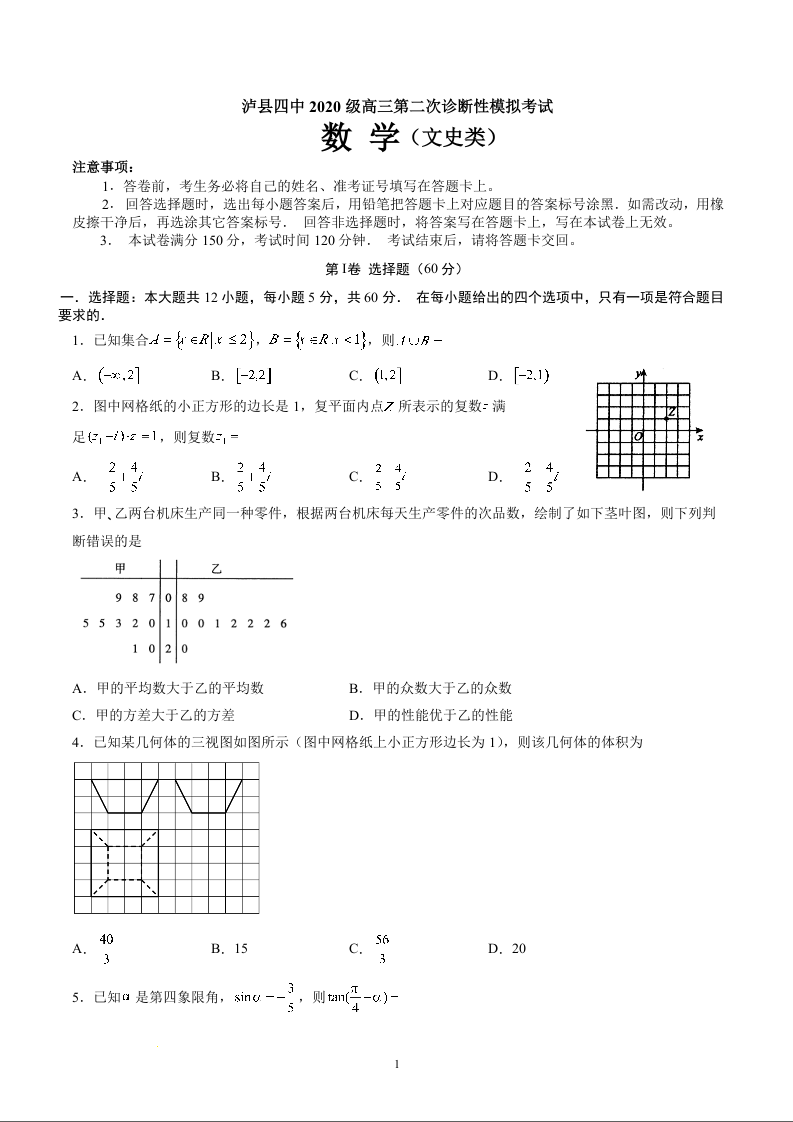 高三文科数学+答案--四川省泸州市2022-2023学年泸县第四中学高三二诊模拟考试