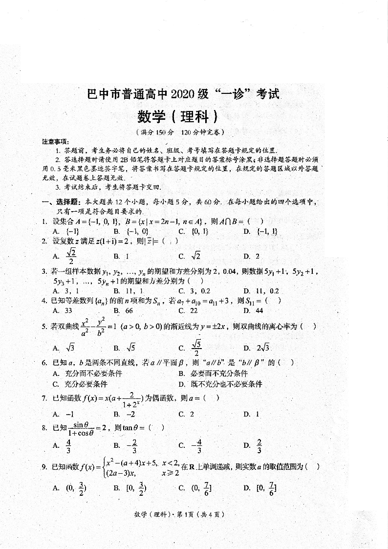 高三理科数学--四川省巴中市2023届高三一诊考试