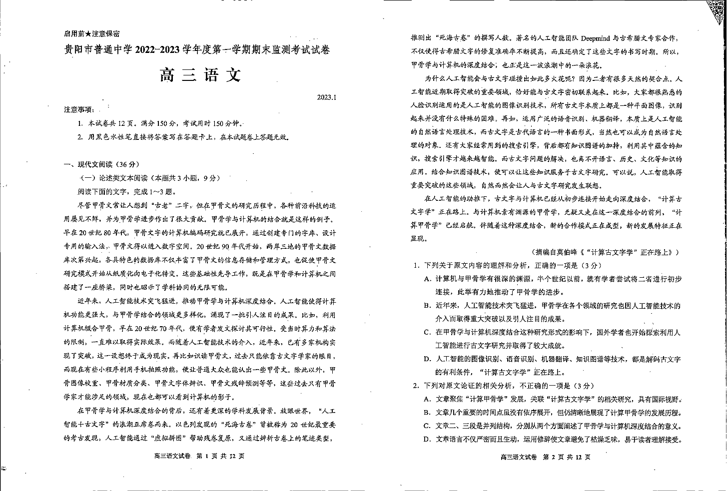 高三语文--贵州省贵阳市普通中学2022-2023学年高三上学期期末监测考试
