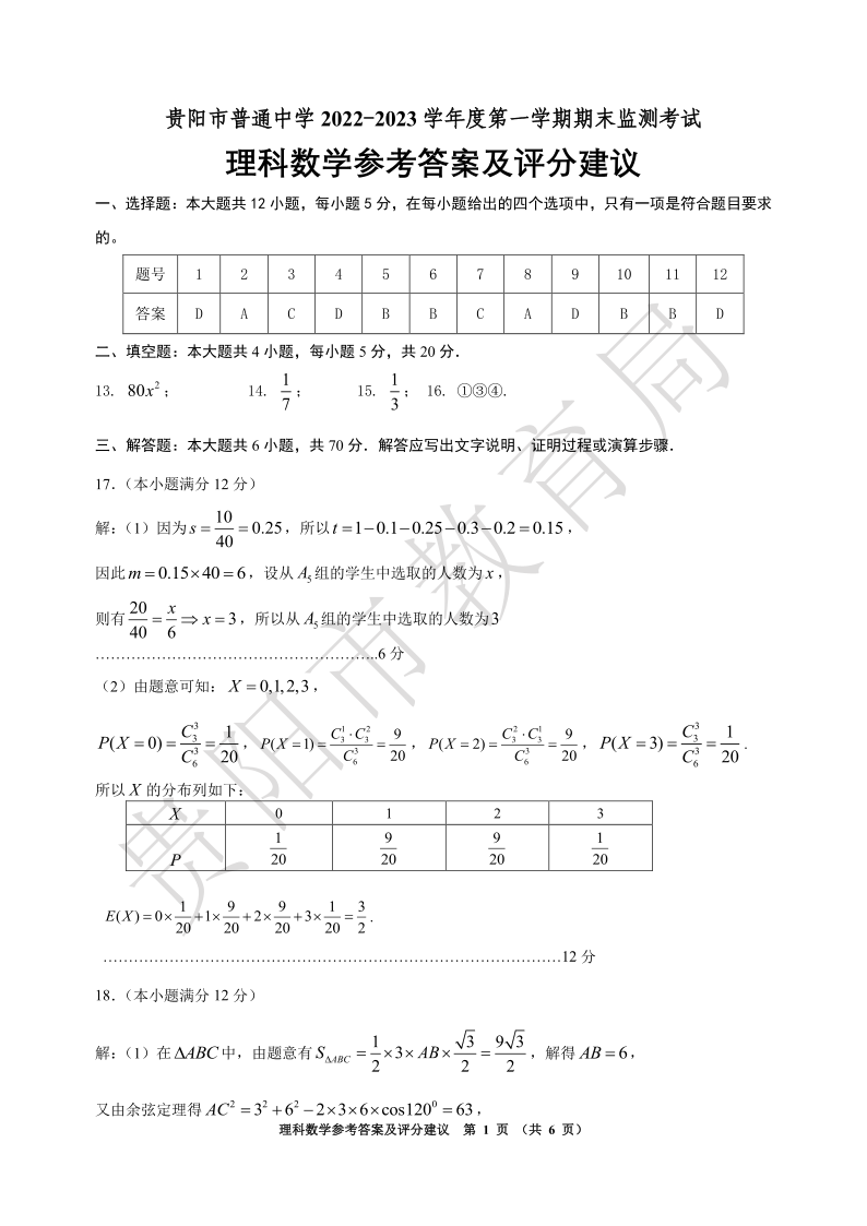 高三理科数学答案--贵州省贵阳市普通中学2022-2023学年高三上学期期末监测考试