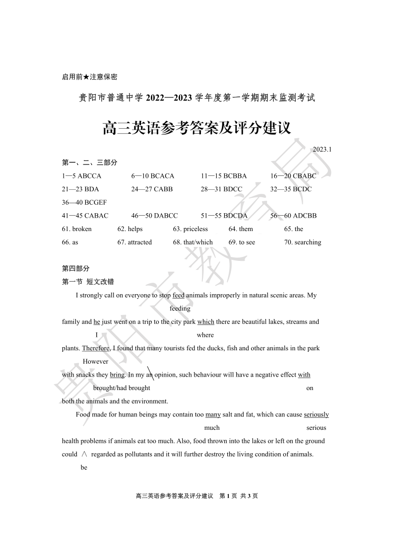 高三英语答案--贵州省贵阳市普通中学2022-2023学年高三上学期期末监测考试