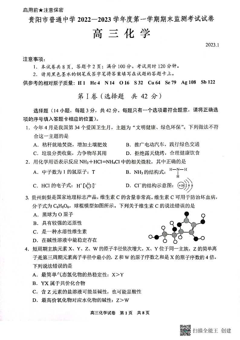 高三化学--贵州省贵阳市普通中学2022-2023学年高三上学期期末监测考试