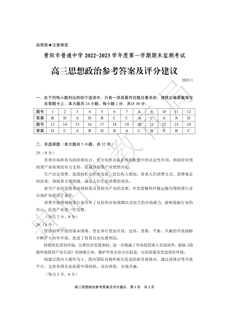 高三政治答案--贵州省贵阳市普通中学2022-2023学年高三上学期期末监测考试