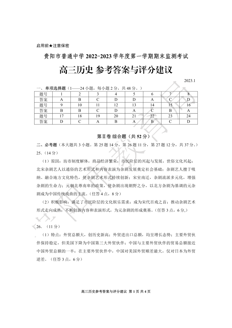 高三历史答案--贵州省贵阳市普通中学2022-2023学年高三上学期期末监测考试