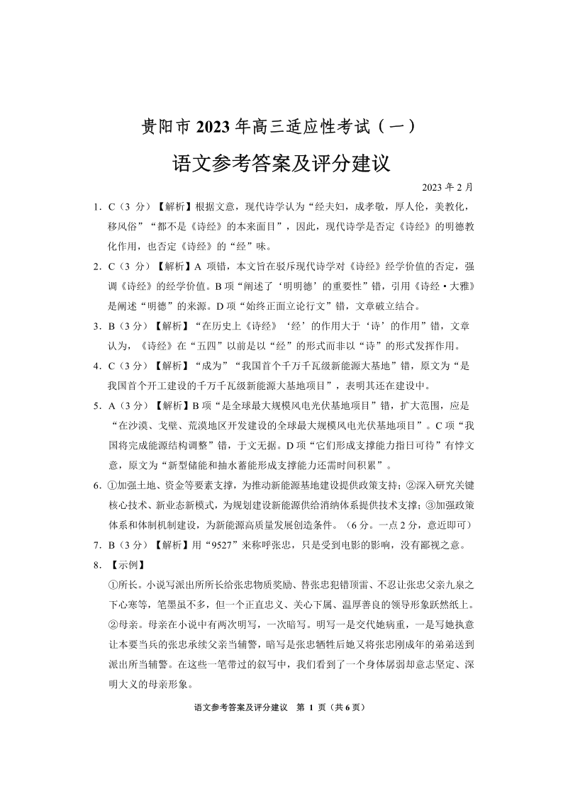 高三语文答案--贵州省贵阳市2023届高三下学期适应性考试(一)