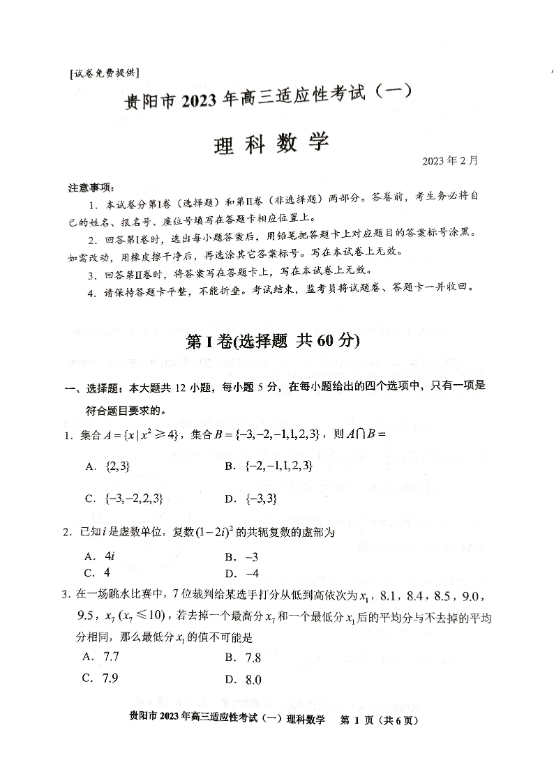高三理科数学--贵州省贵阳市2023届高三下学期适应性考试(一)