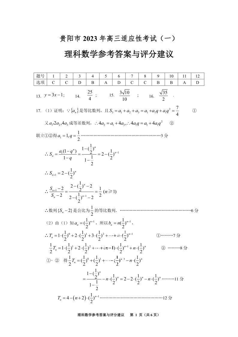 高三理科数学答案--贵州省贵阳市2023届高三下学期适应性考试(一)