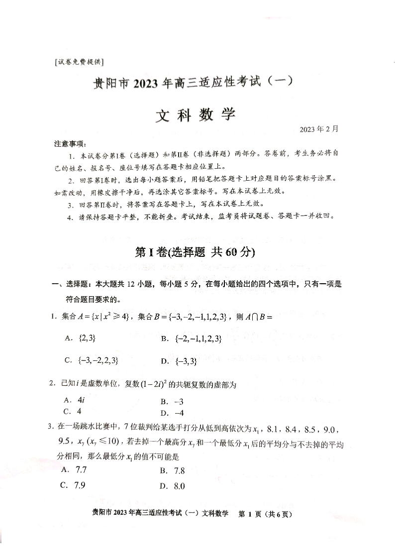 高三文科数学--贵州省贵阳市2023届高三下学期适应性考试(一)