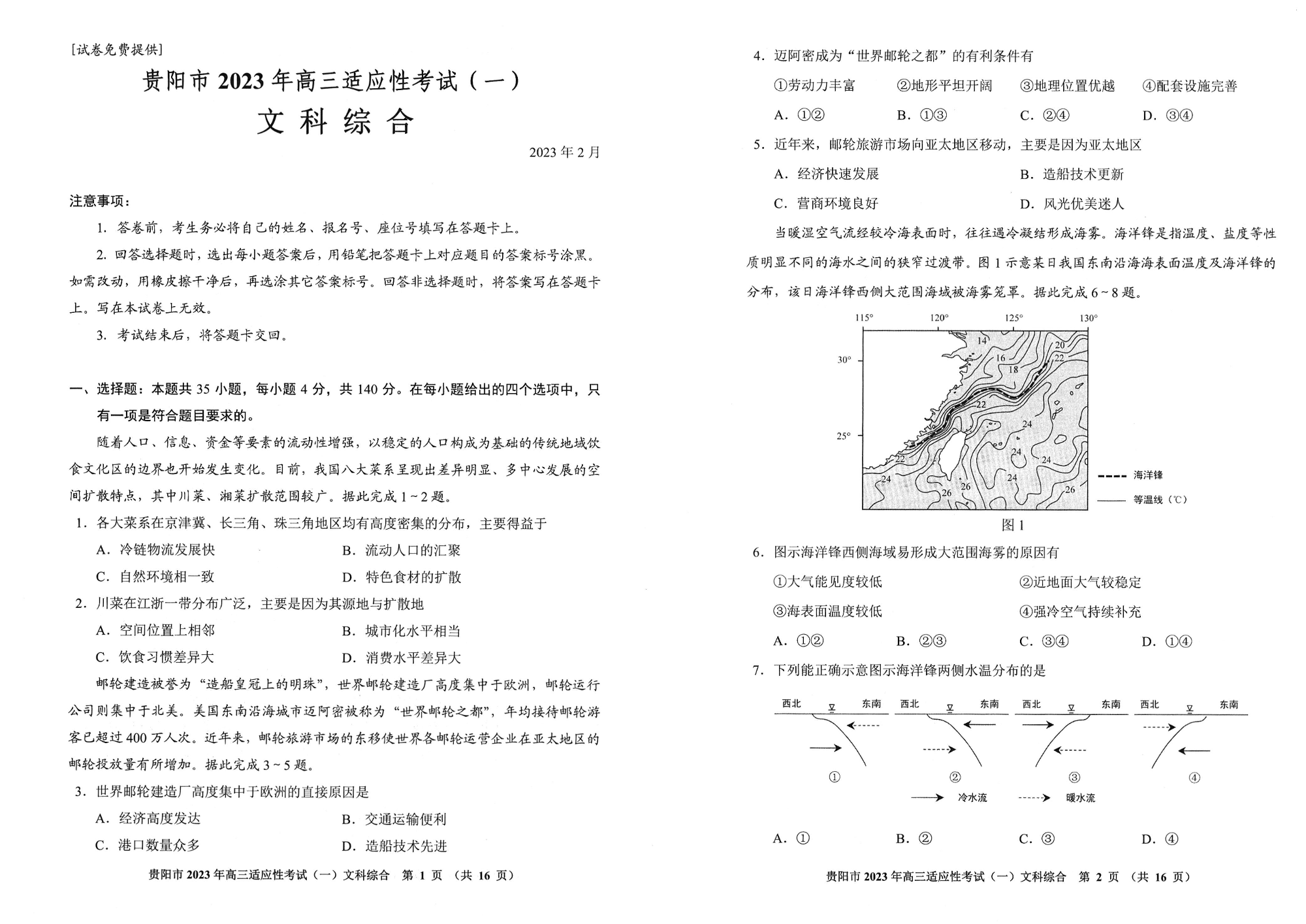高三文综--贵州省贵阳市2023届高三下学期适应性考试(一)