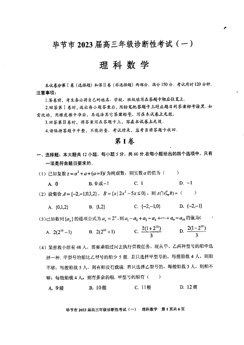 高三理科数学--贵州省毕节市2023届高三年级诊断性考试(一)