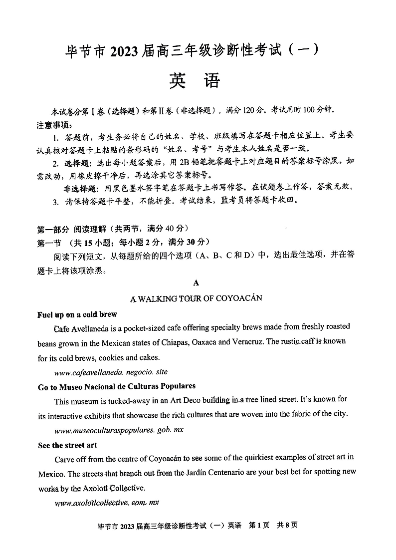 高三英语--贵州省毕节市2023届高三年级诊断性考试(一)