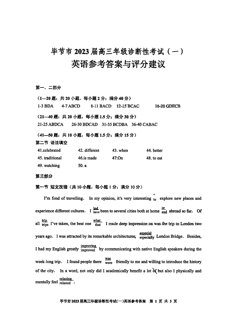 高三英语答案--贵州省毕节市2023届高三年级诊断性考试(一)
