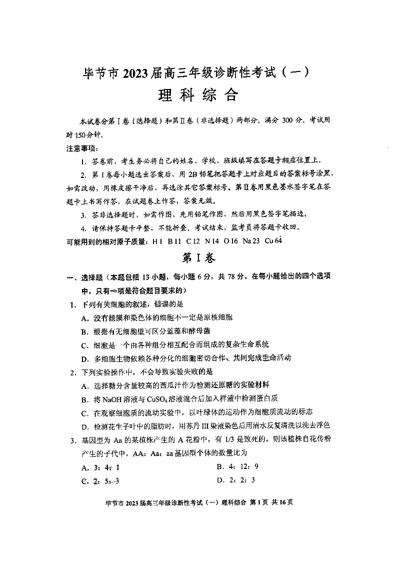 高三理综--贵州省毕节市2023届高三年级诊断性考试(一)