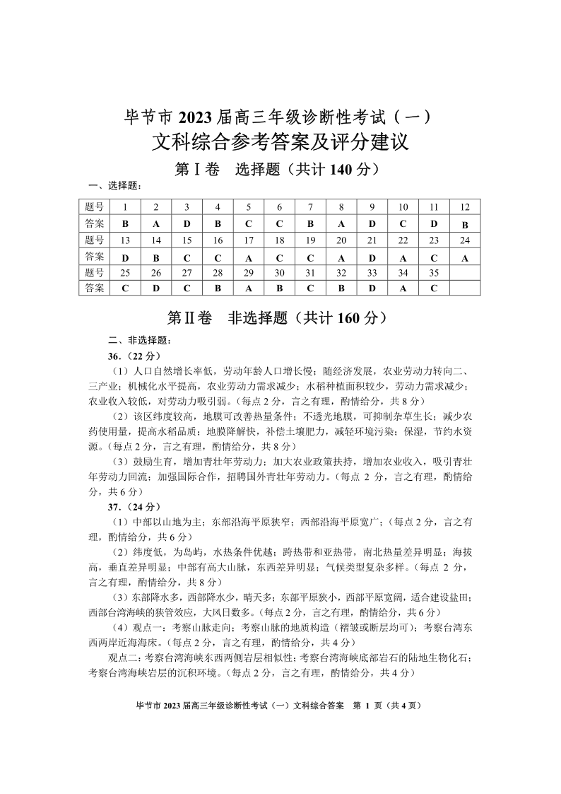 高三文综答案--贵州省毕节市2023届高三年级诊断性考试(一)