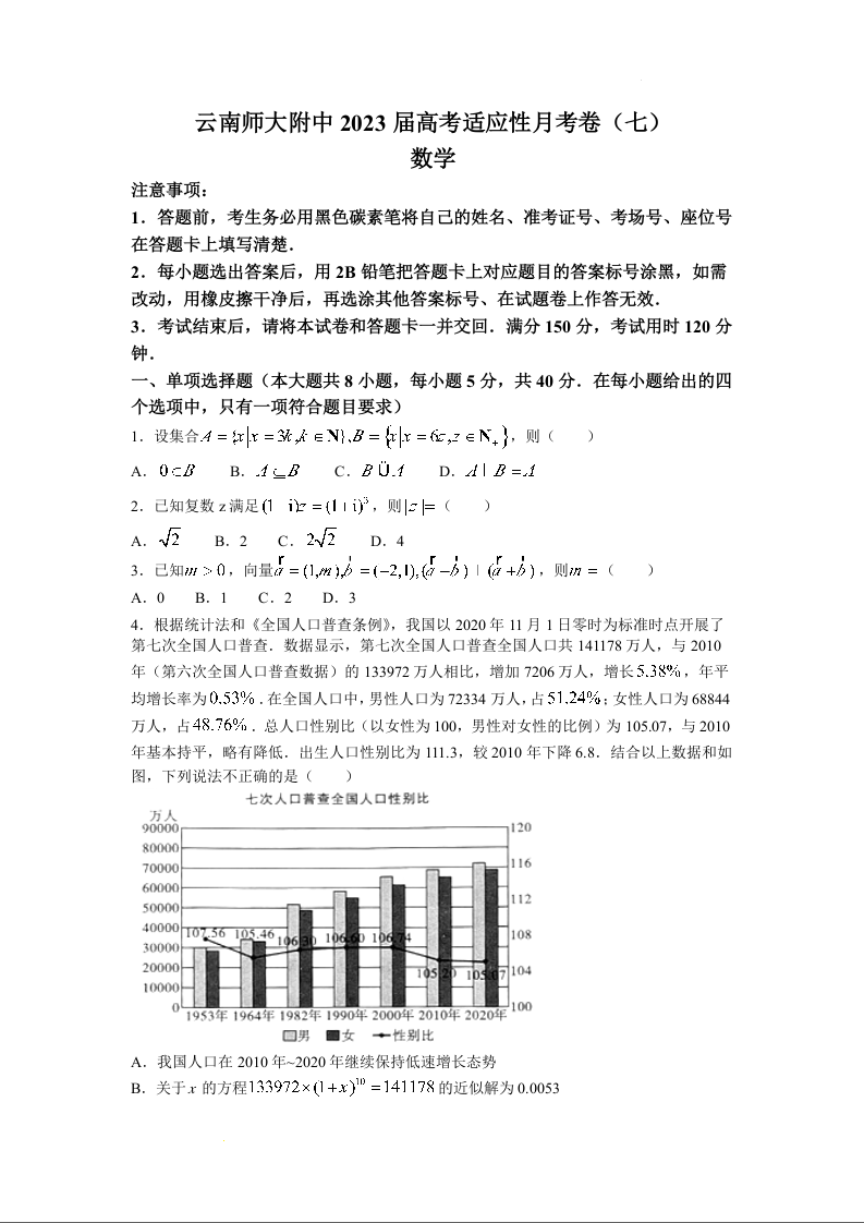 高三数学--云南师大附中2023届高考适应性月考卷(七)