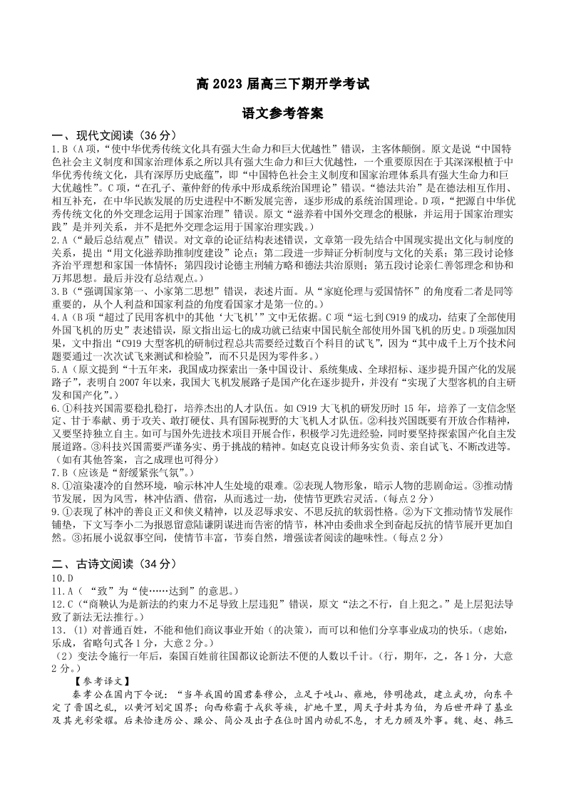 高三语文答案--四川省成都市第七中学2023届高三下学期入学考试
