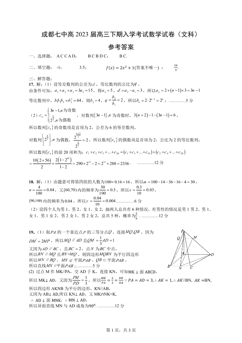 高三文科数学答案--四川省成都市第七中学2023届高三下学期入学考试