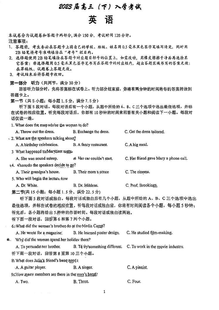 高三英语+答案--四川省成都市第七中学2023届高三下学期入学考试