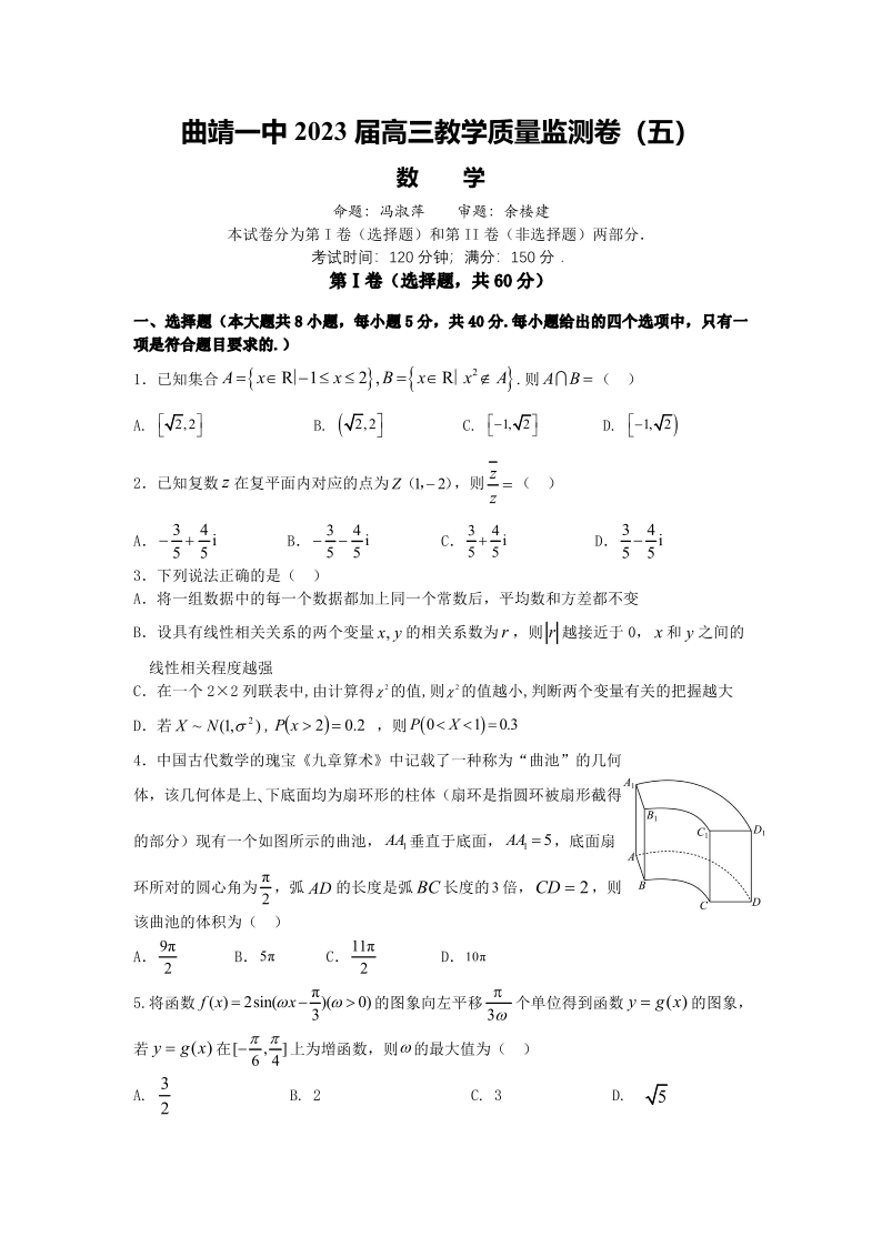 高三数学--云南省曲靖市第一中学2022-2023学年高三下学期教学质量监测试卷(五)