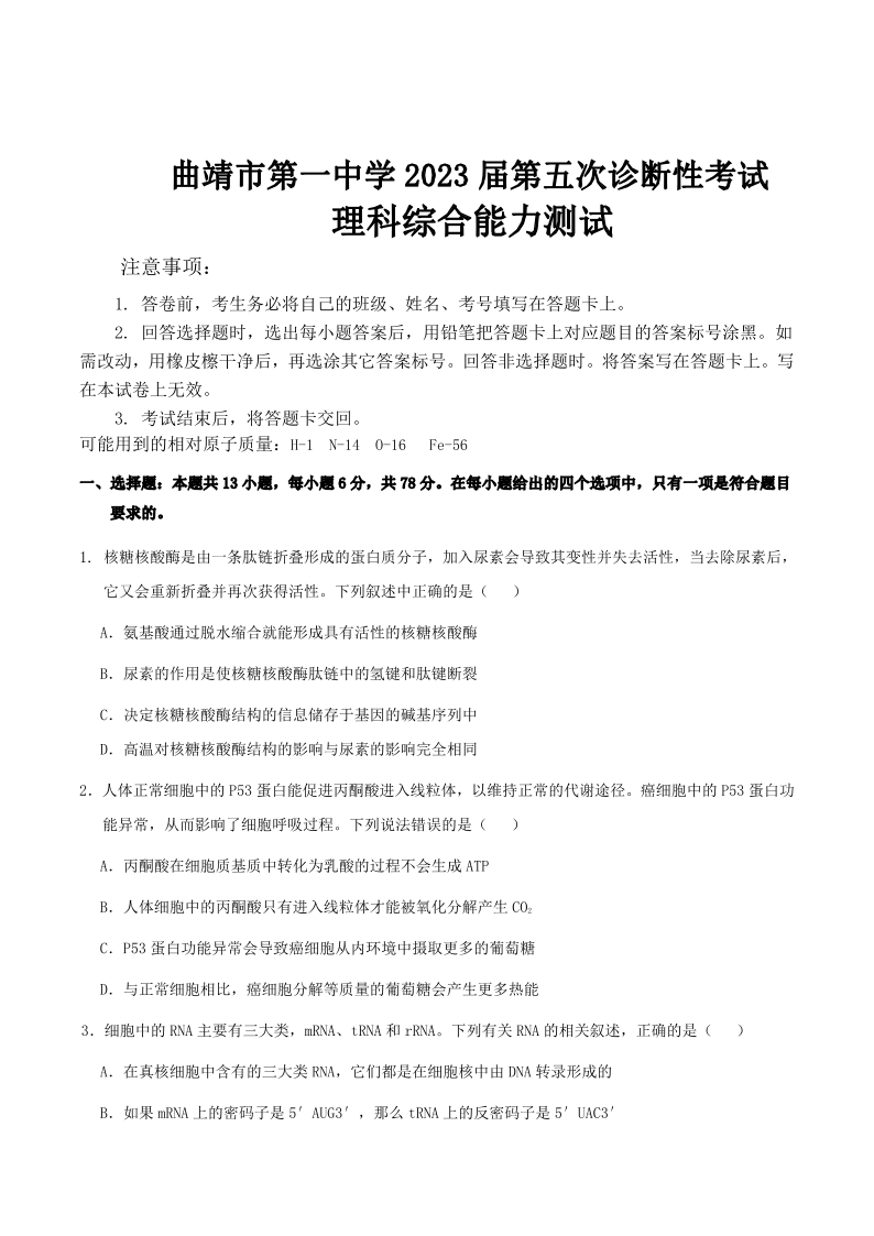 高三理综--云南省曲靖市第一中学2022-2023学年高三下学期教学质量监测试卷(五)