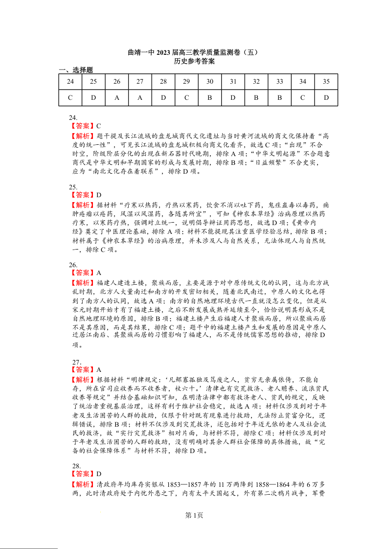 高三文综历史答案--云南省曲靖市第一中学2022-2023学年高三下学期教学质量监测试卷(五)