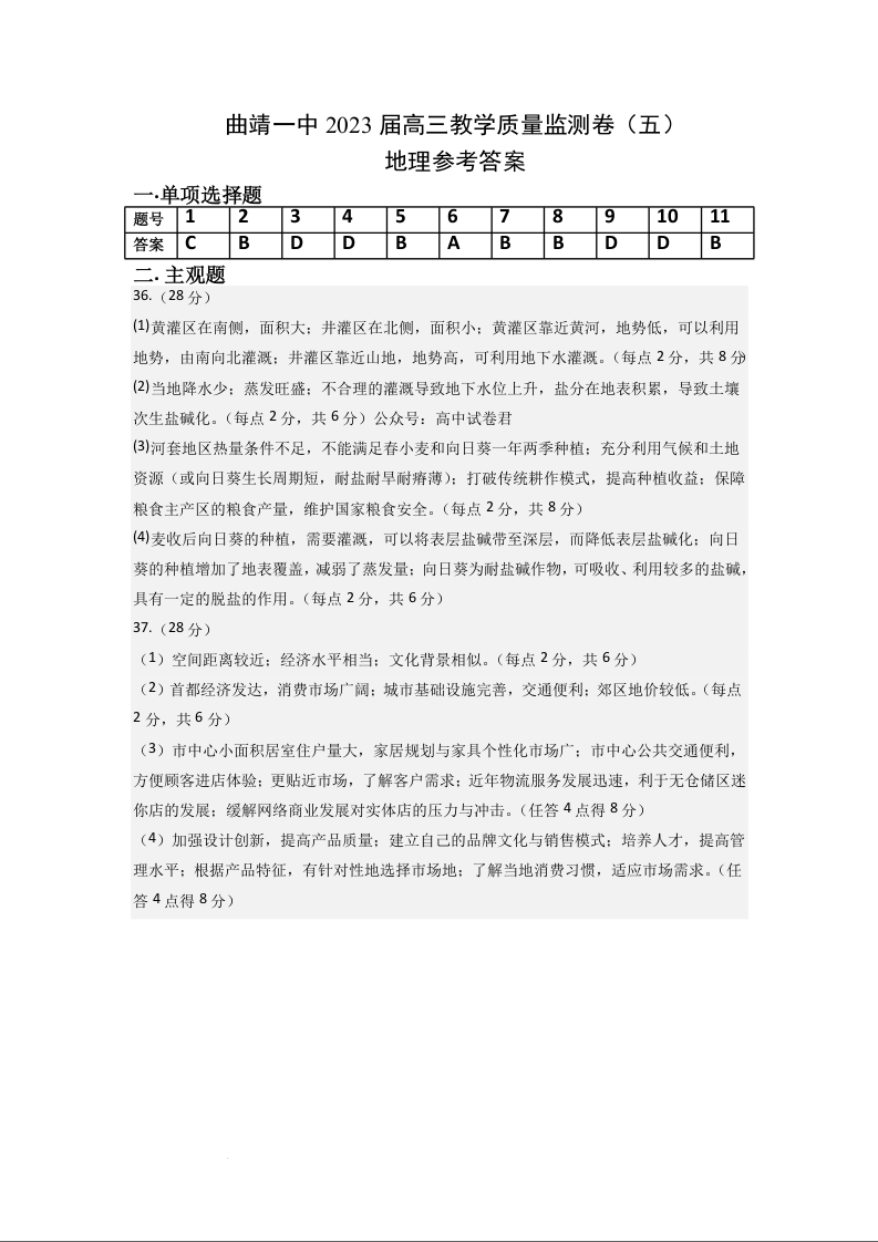 高三文综地理答案--云南省曲靖市第一中学2022-2023学年高三下学期教学质量监测试卷(五)