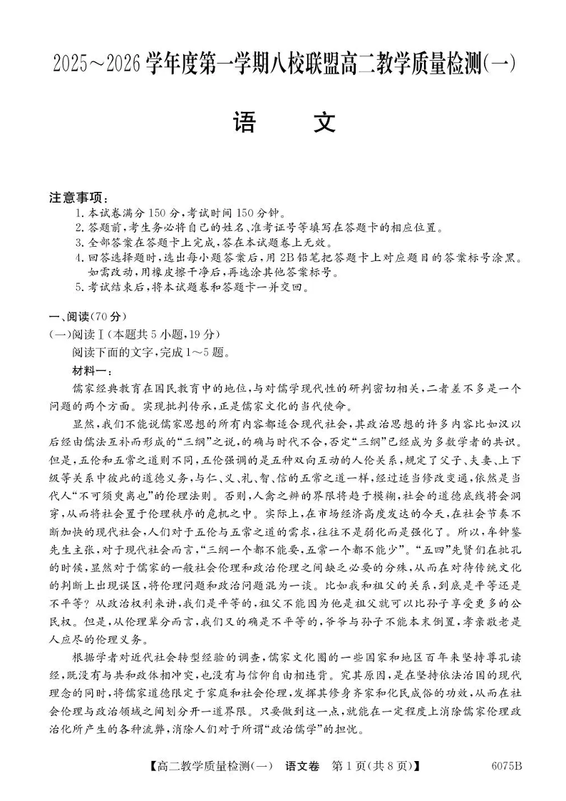高二语文+答案--广东省八校联盟2025-2026学年高二上学期教学质量检测(一)