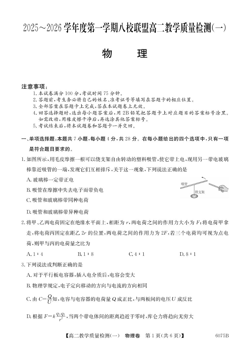 高二物理+答案--广东省八校联盟2025-2026学年高二上学期教学质量检测(一)