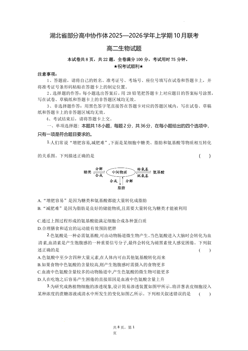 高二生物--湖北省部分高中协作体2025-2026学年高二上学期10月月考