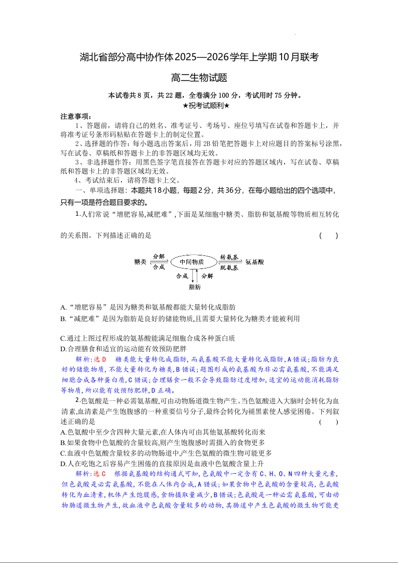 高二生物(解析版)--湖北省部分高中协作体2025-2026学年高二上学期10月月考