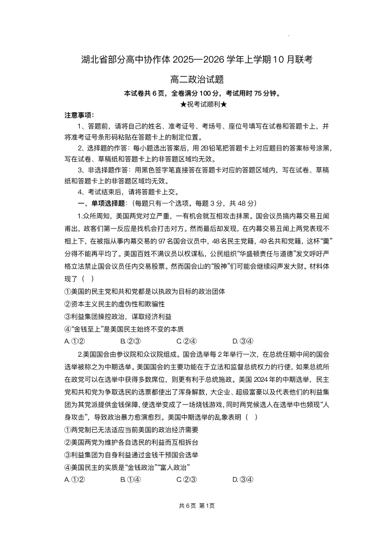 高二政治+答案--湖北省部分高中协作体2025-2026学年高二上学期10月月考