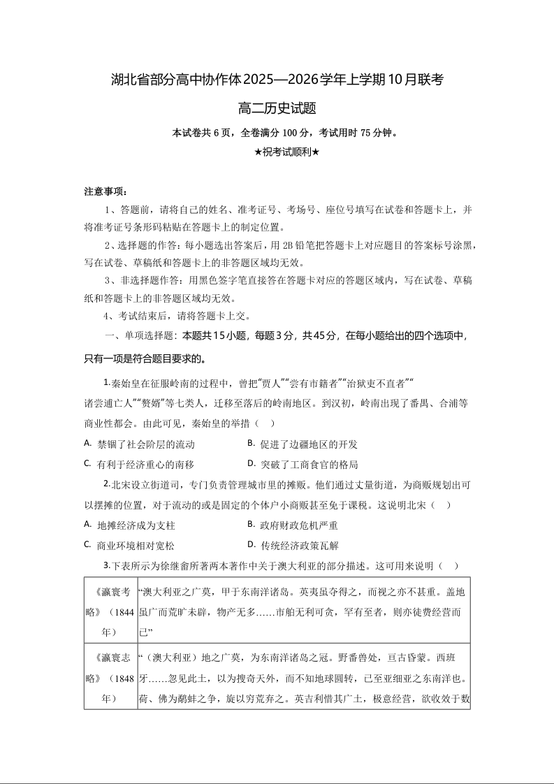 高二历史--湖北省部分高中协作体2025-2026学年高二上学期10月月考