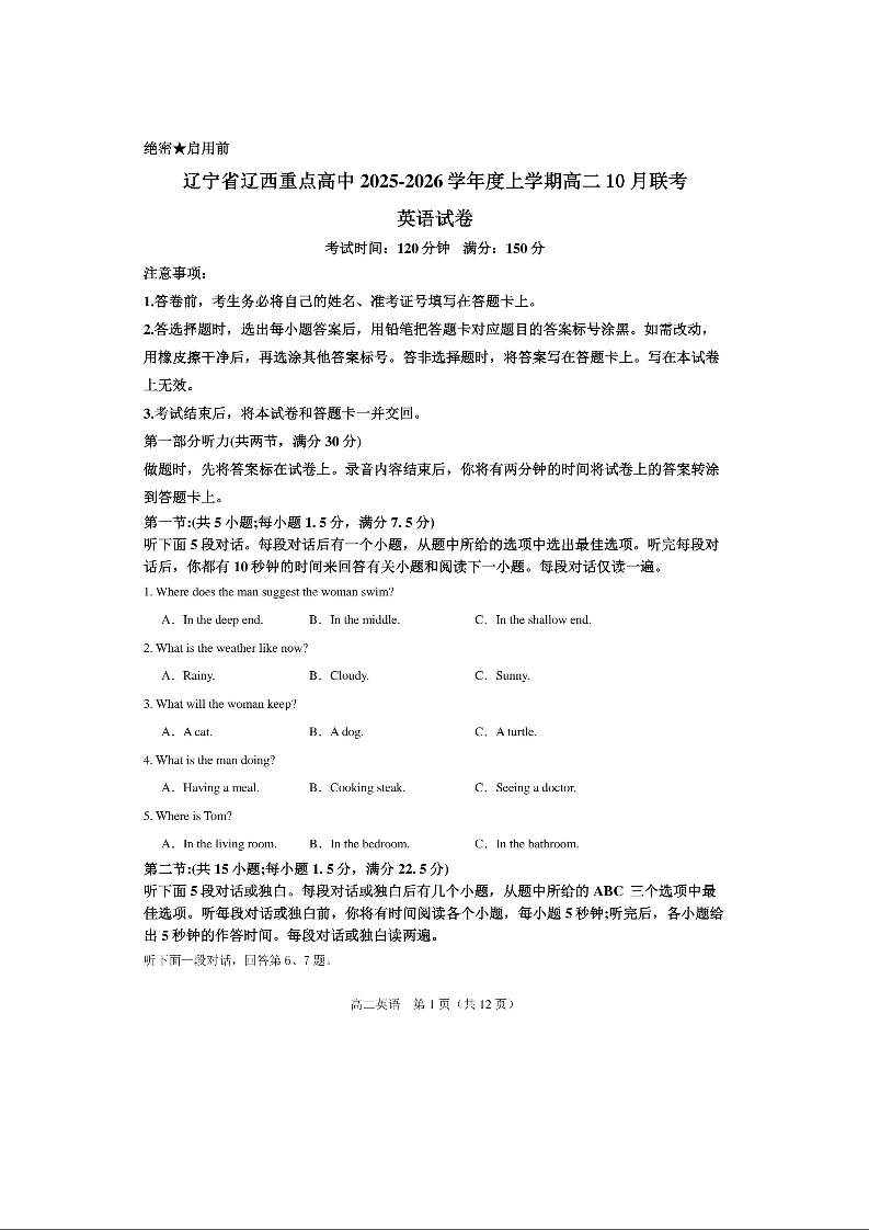 高二英语--辽西重点高中2025-2026学年高二上学期10月月考