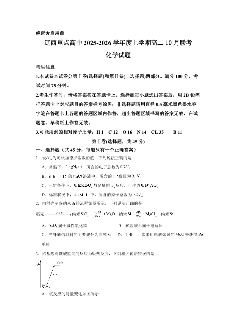 高二化学--辽西重点高中2025-2026学年高二上学期10月月考