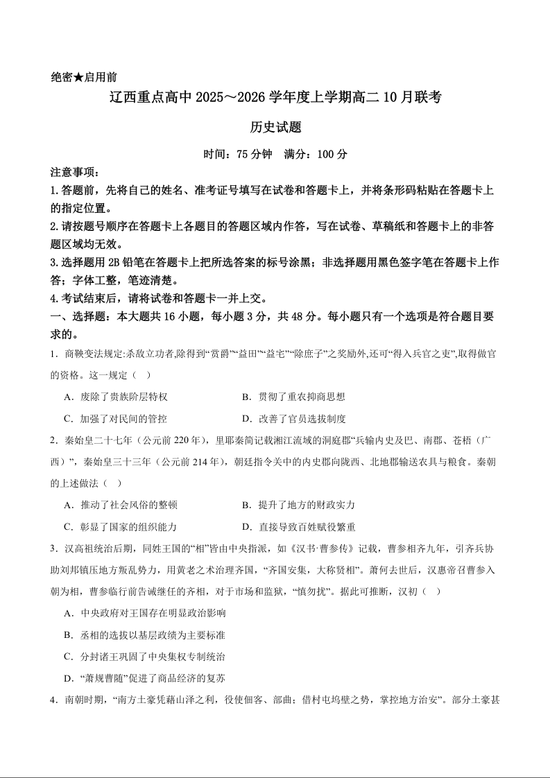 高二历史--辽西重点高中2025-2026学年高二上学期10月月考