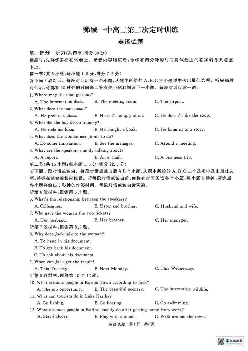 高二英语+答案--山东省菏泽市鄄城县第一中学2025-2026学年高二上学期10月月考