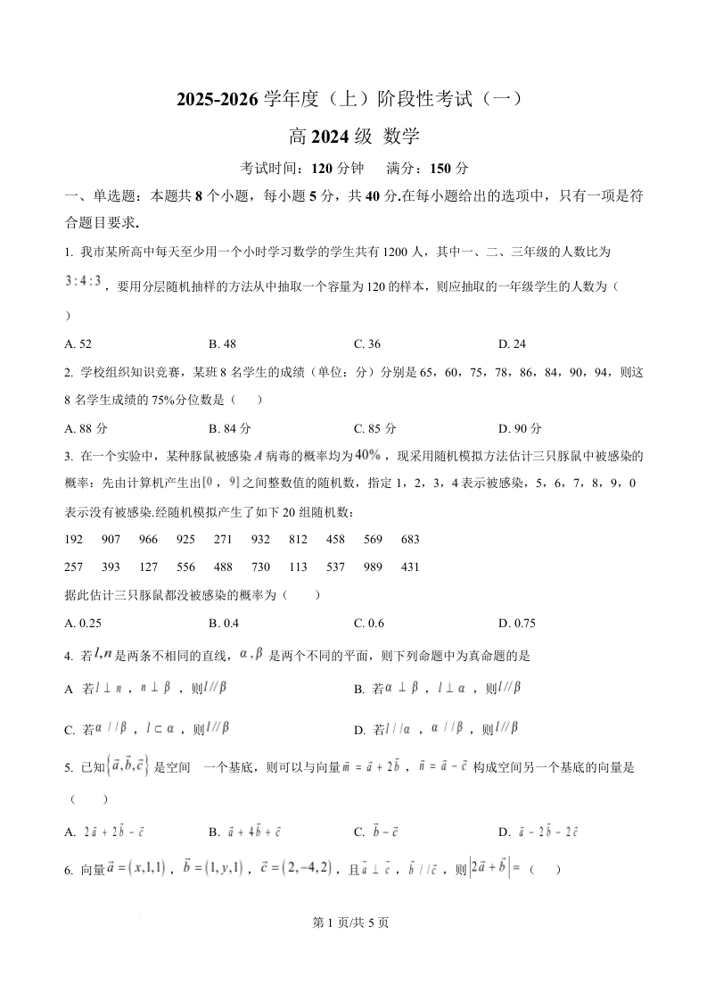 高二数学(原卷版)--四川省成都市成华区某校2025-2026学年高二上学期阶段性考试(一)
