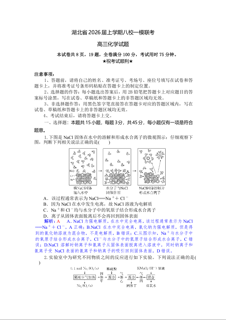 高三化学(精品解析版)--湖北省八校2026届高三上学期一模考试