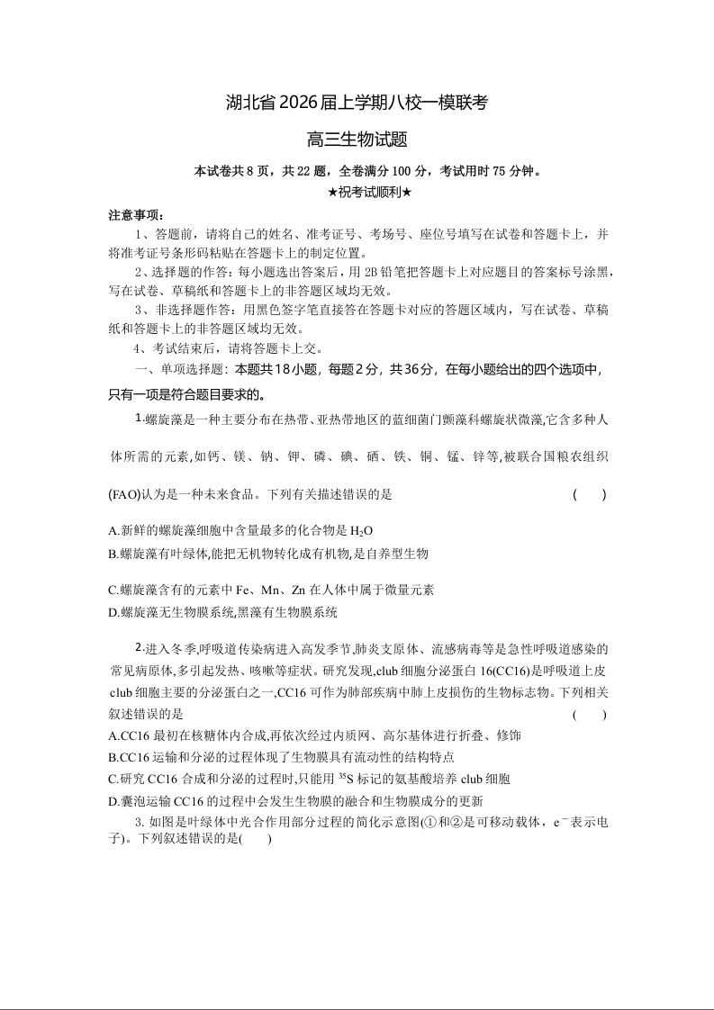 高三生物(原卷版)--湖北省八校2026届高三上学期一模考试
