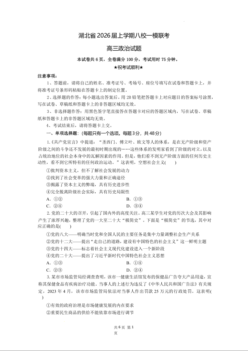 高三政治(原卷版)--湖北省八校2026届高三上学期一模考试